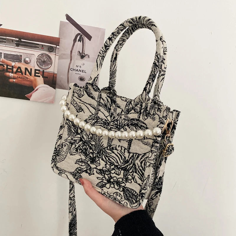 Enhance your spring and summer outfits with our PearlCanvas Handbag – a stunning bag that radiates timeless beauty with its exquisite pearl feature & tropical canvas design. Crafted with meticulous attention to detail, this handbag is a true testament to refined elegance and luxury.