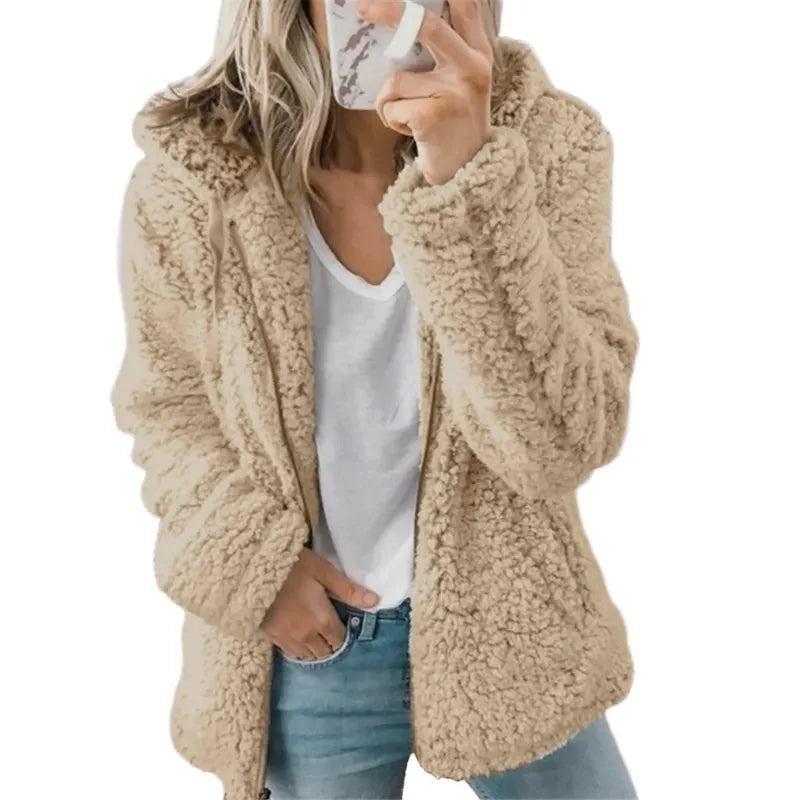 Plush Fuzziness: Dive into a world of softness and warmth. Our women's jacket boasts a plush, fuzzy texture that feels like a gentle embrace against your skin. It's the ultimate cocoon of comfort.